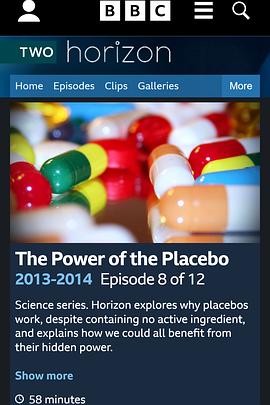 They are the miracle pills that shouldn't really work at all. Placebos come in all shapes and sizes, but they contain no active ingredient. Now they are being shown to help treat pain, depression and even alleviate some of the symptoms of Parkinson's disease. Horizon explores why they work, and how we could all benefit from the hidden power of the placebo.收起
